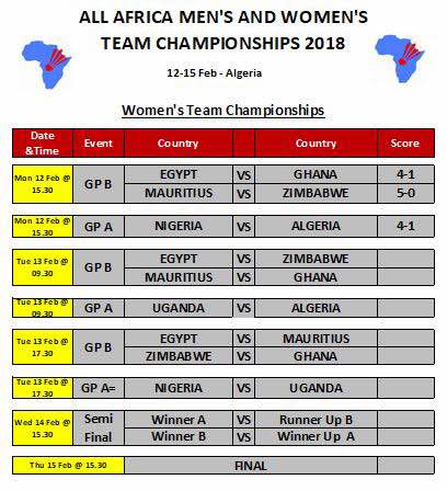 In game four the duo of Enejoh Abah and Clement Krobapor beat the dou of Adam el Mernissi and Ahmed Amine 21-12, 21-3 while Habbeb Bello and Usman Isiaq made it 5-0 for Nigeria defeating Yassine El Mernissi and Bilal El harab 21-18, 21-13. In the Women’s category Africa and Nigeria No 1 ranked player Dorcas Adesokan led the way for a 4-1 victory for Team Nigeria who silenced the home fans after an emphatic victory.Dorcas beat Linda Mazri 21-12 , 21-16, Halla Bouksani drew level for Algeria when she beat Zainab Momoh 18-21, 21-12 ,21-10.Uchechukwu Deborah Ukeh put Nigeria ahead with a 21-12 ,21-8 victory over Malak Ouchefoun in 20 minutes. In the Doubles event any hopes held by the host were dashed as Dorcas Adesokan and Uchechukwu Deborah beat the duo of Linda Mazri and Dounia Naama 21-15, 21-7 while Zainab Momoh and Peace Orji completed the day’s victory for Nigeria winning Halla Bouksani and Malak Ouchefoun 22-20, 21-13.